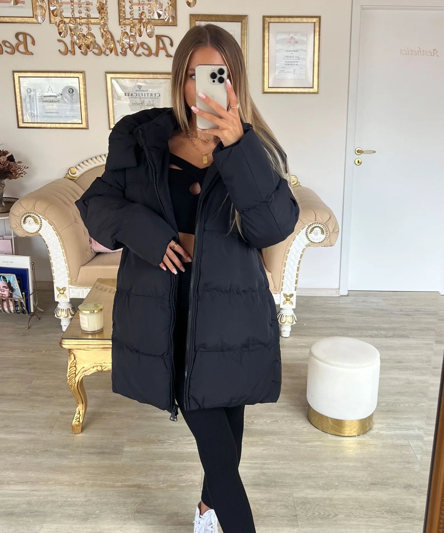 Superleuke oversized jas. De capuchon is afneembaar. Houdt je bijzonder warm en is daarom perfect voor koudere dagen. Het model is 1,69 m lang en draagt maat S.