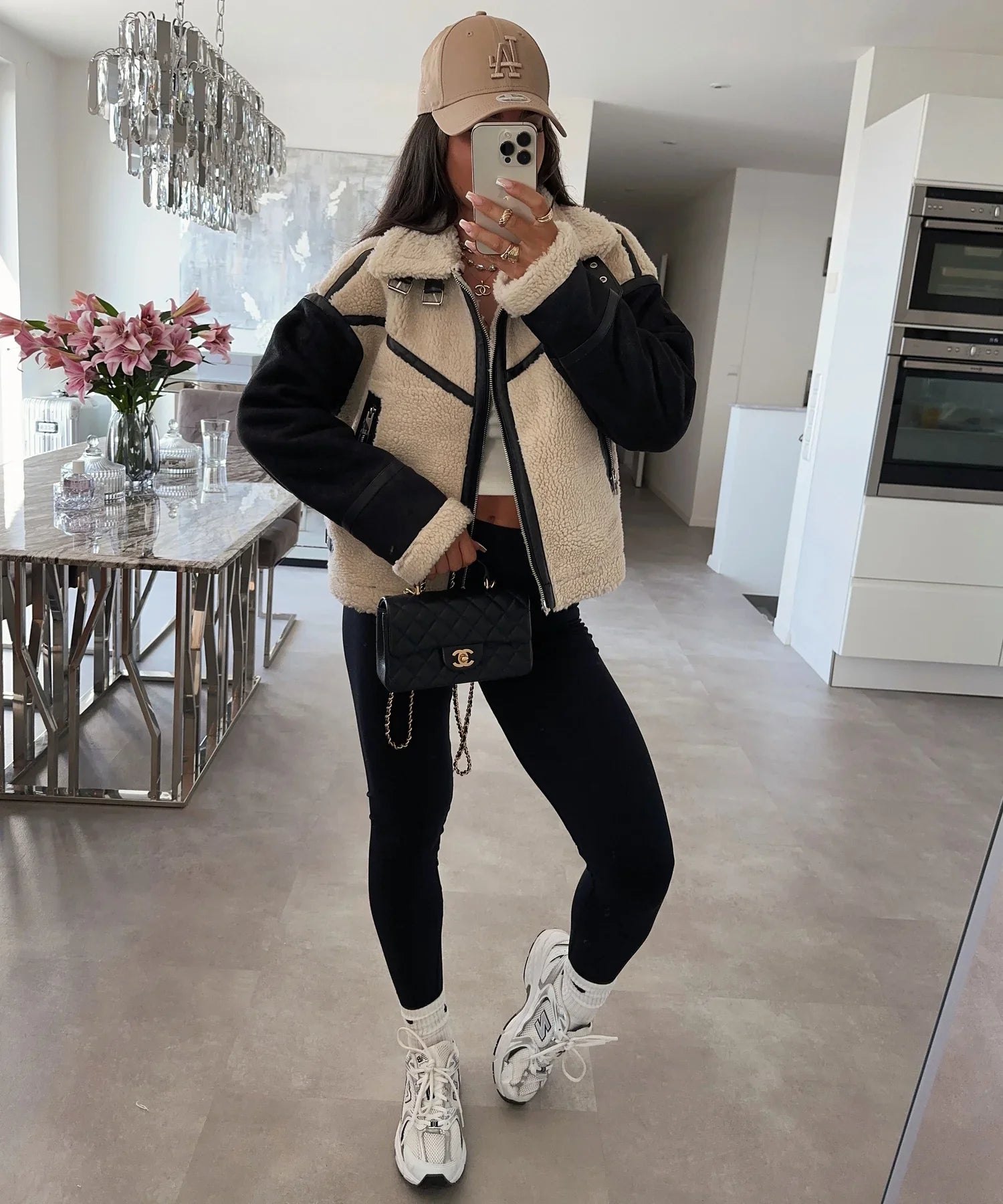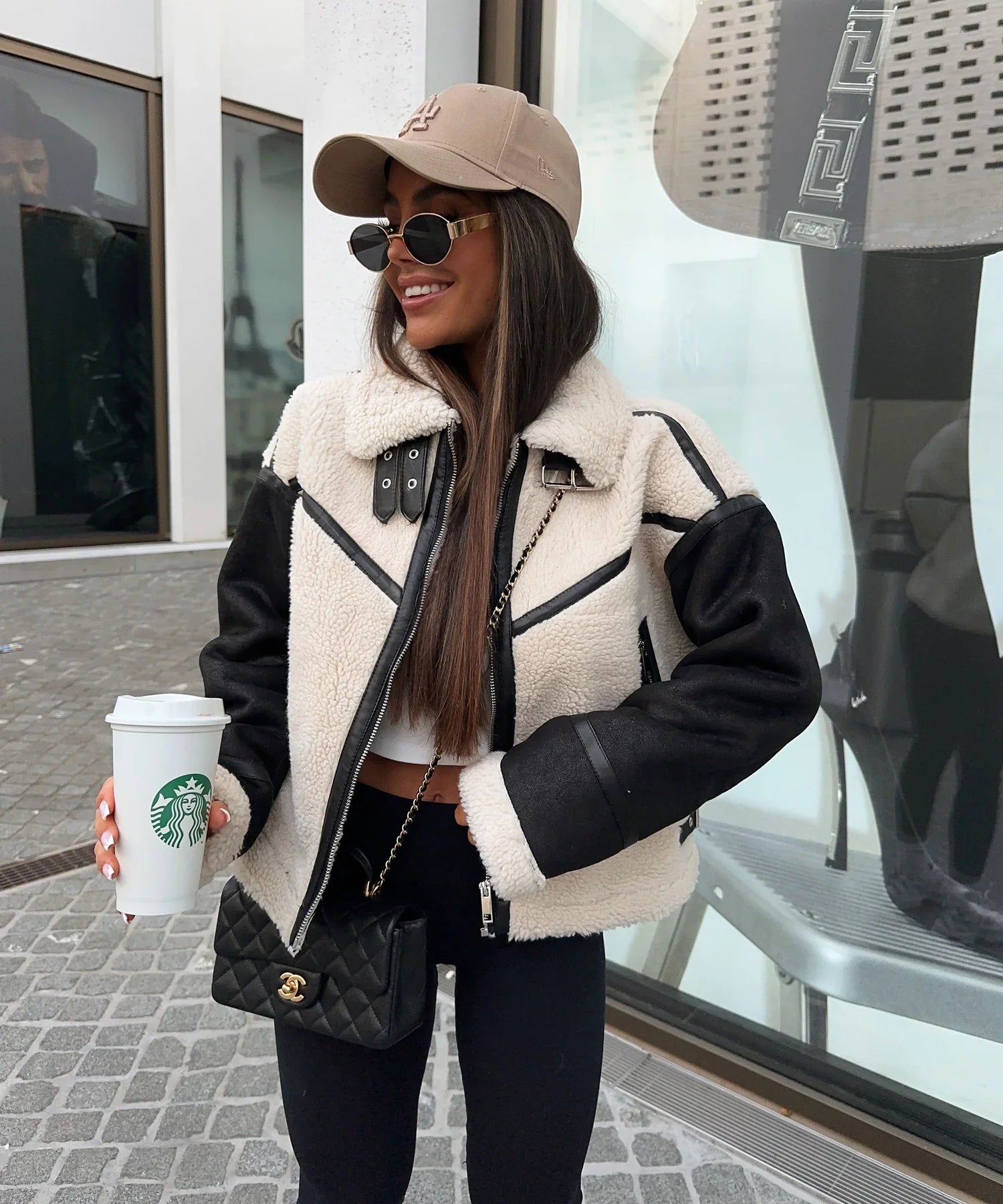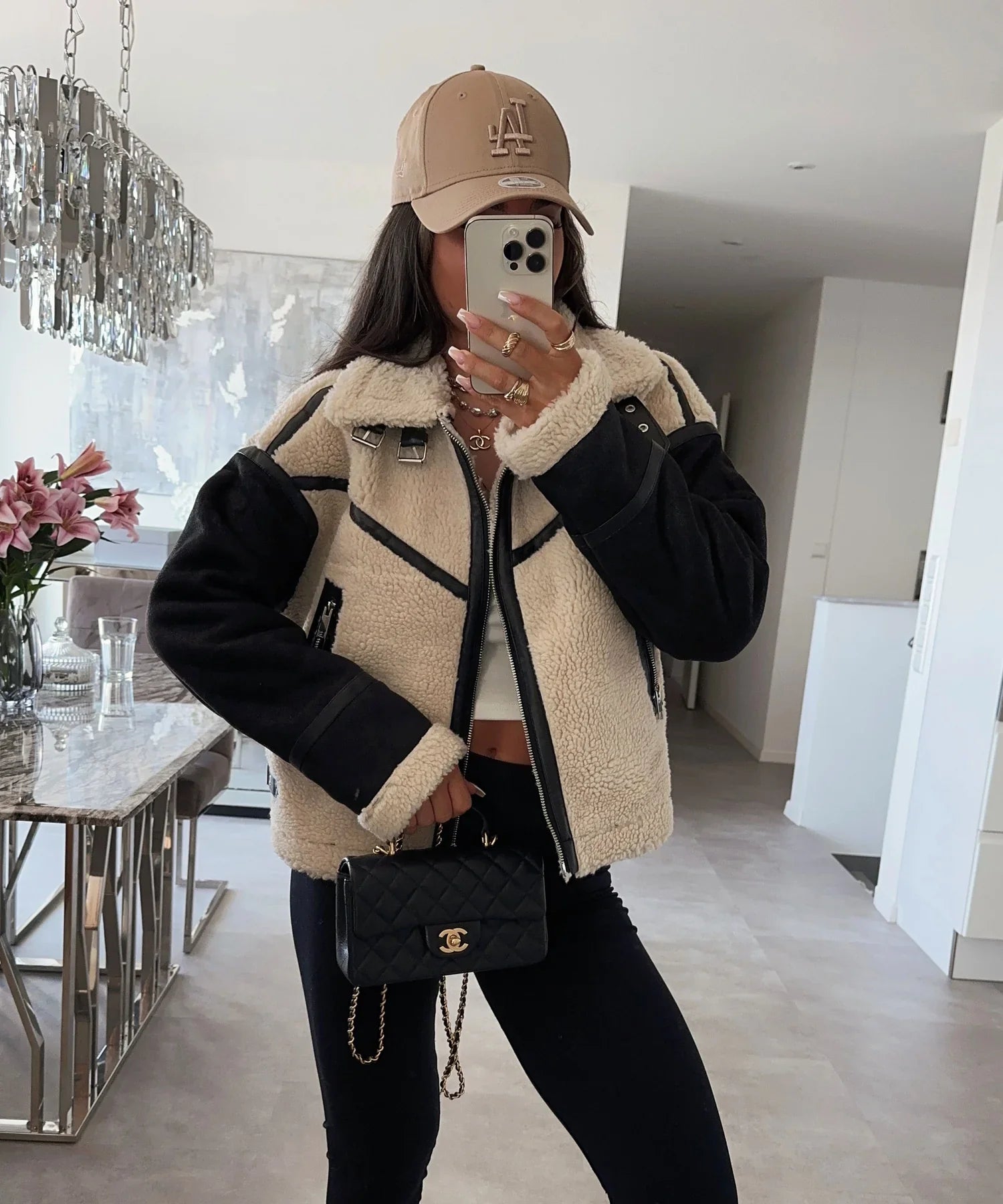Superleuk bikerjack met teddybont. Het model is 1,65 m lang en draagt maat S.